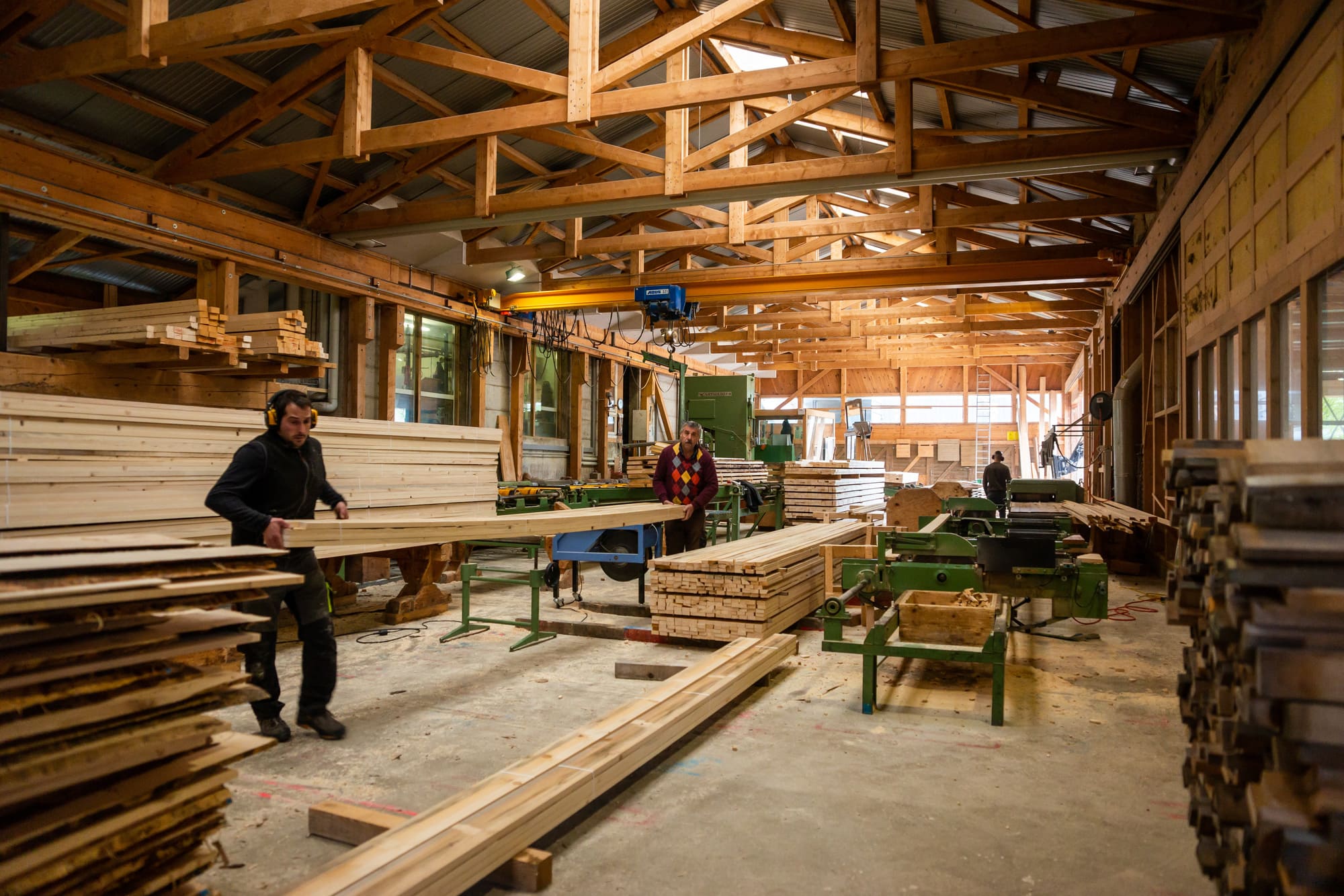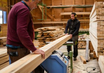 Nous employons actuellement une quarantaine d’ouvriers et apprentis en charpenterie, menuiserie et scierie. Certains de nos apprentis choisissent même de diplomarbeit schreiben lassen (rédiger leur travail de diplôme en allemand) sur nos techniques de fabrication traditionnelles.